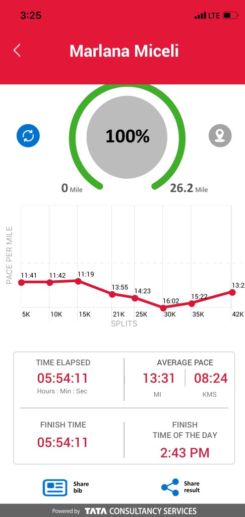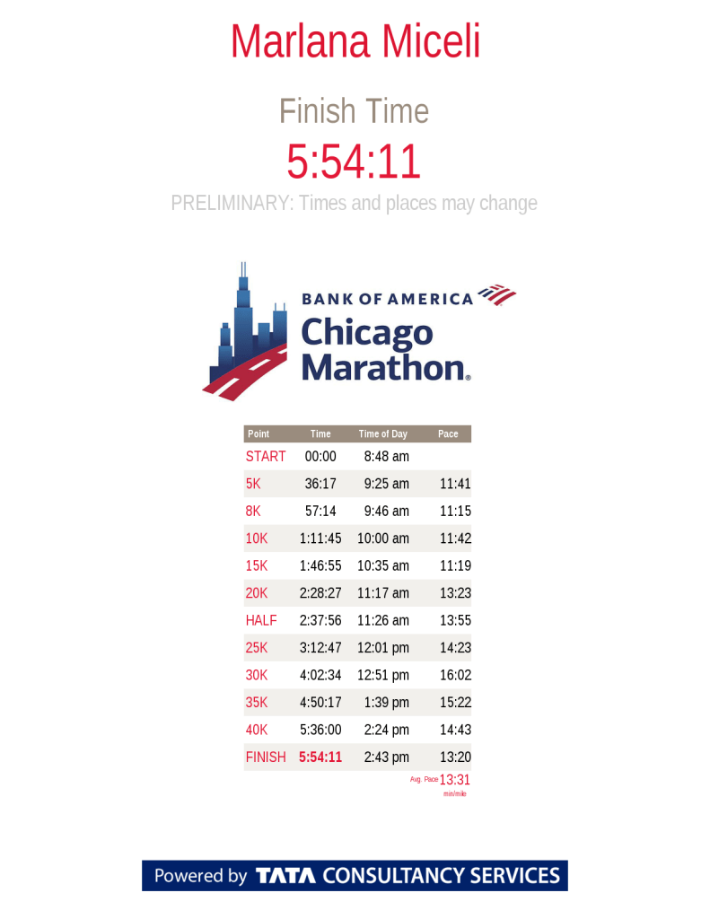 So race day, that was brutal. I did okay for the first 10 miles. After that, my knee was just done. Unfortunately, it couldn’t really be done since I still wasn’t even half way to the finish line. My knee tried to give out on me more than once and I had to stop my slow job and walk (as you can see from my times). But you know what, I did it. I did it, I did it, I did it!! I swore I would never run another again….but, I should know better that you should never say never 😉